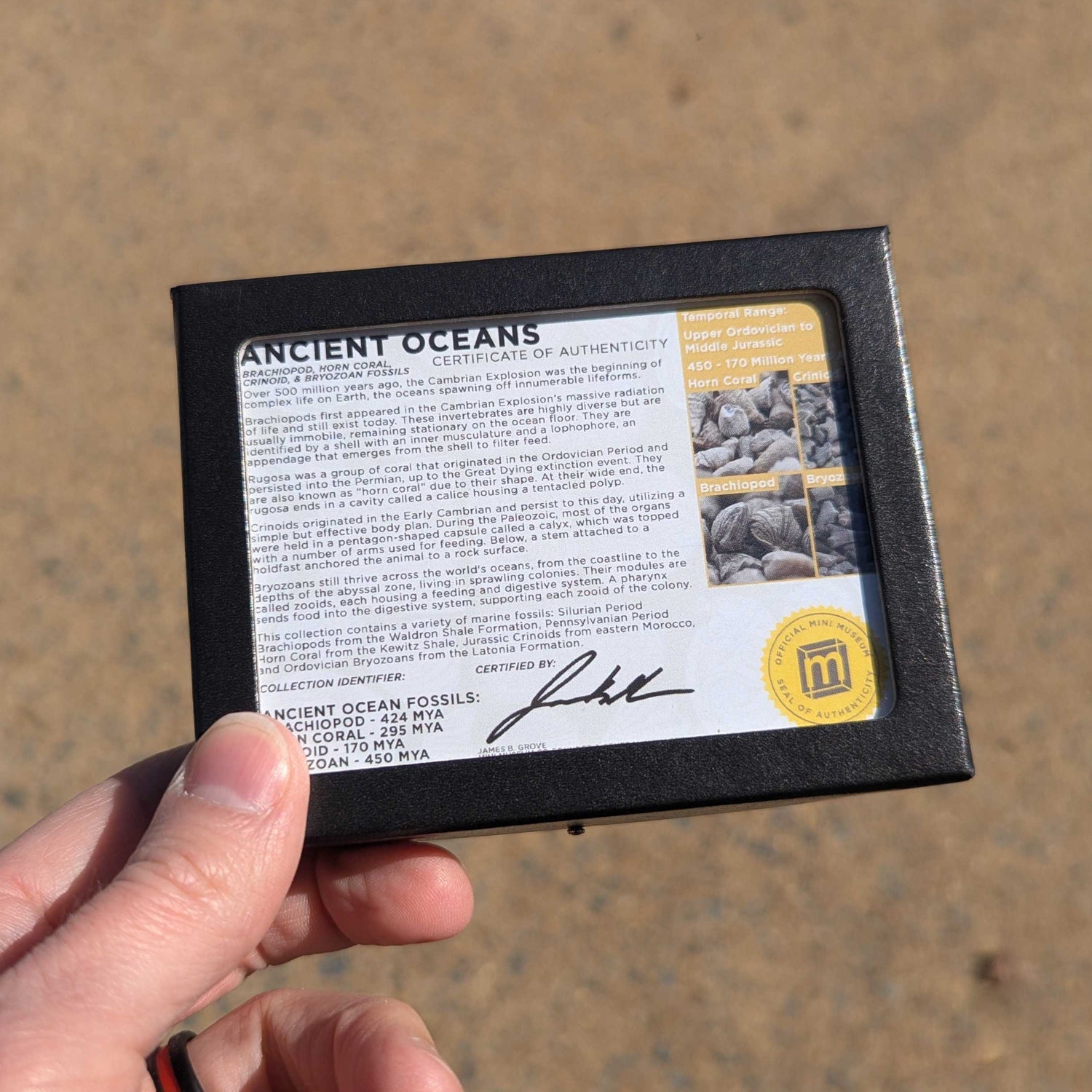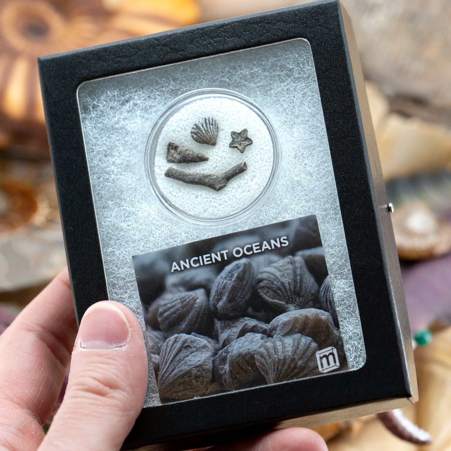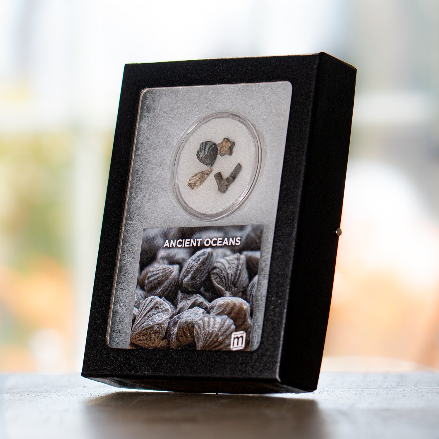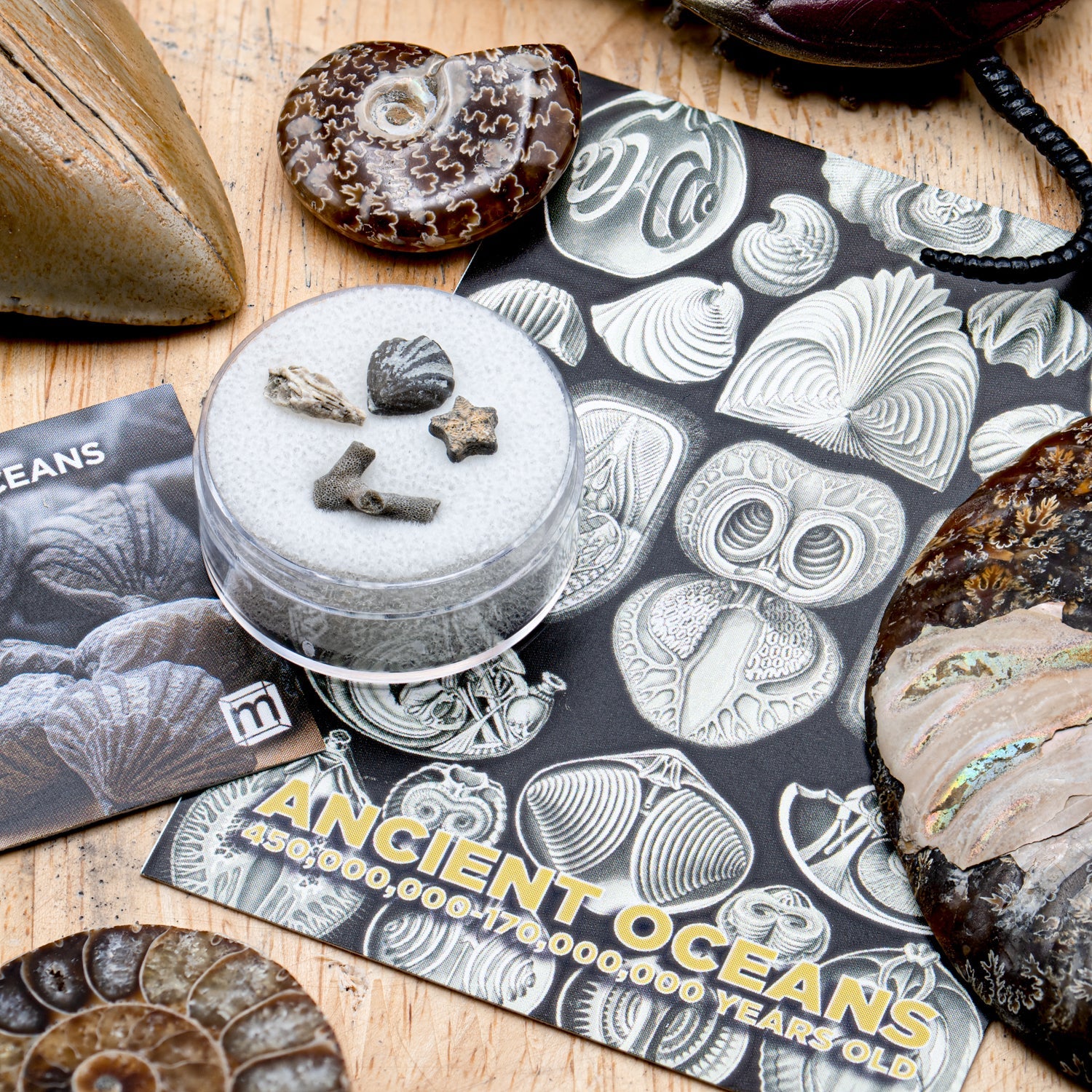 Now, you can collect a timeline of our planet's aquatic life with the Mini Museum Ancient Oceans specimen. This item is a collection of tiny sea creature fossils showcasing the diversity of our world's oceans. Each collection includes four fossils: Brachiopod, Horn Coral, Crinoid, and Bryozoan. Together, they comprise over 250 million years from the Ordovician to the Jurassic. A certificate of authenticity and photo identification guide is included with each fossil set!