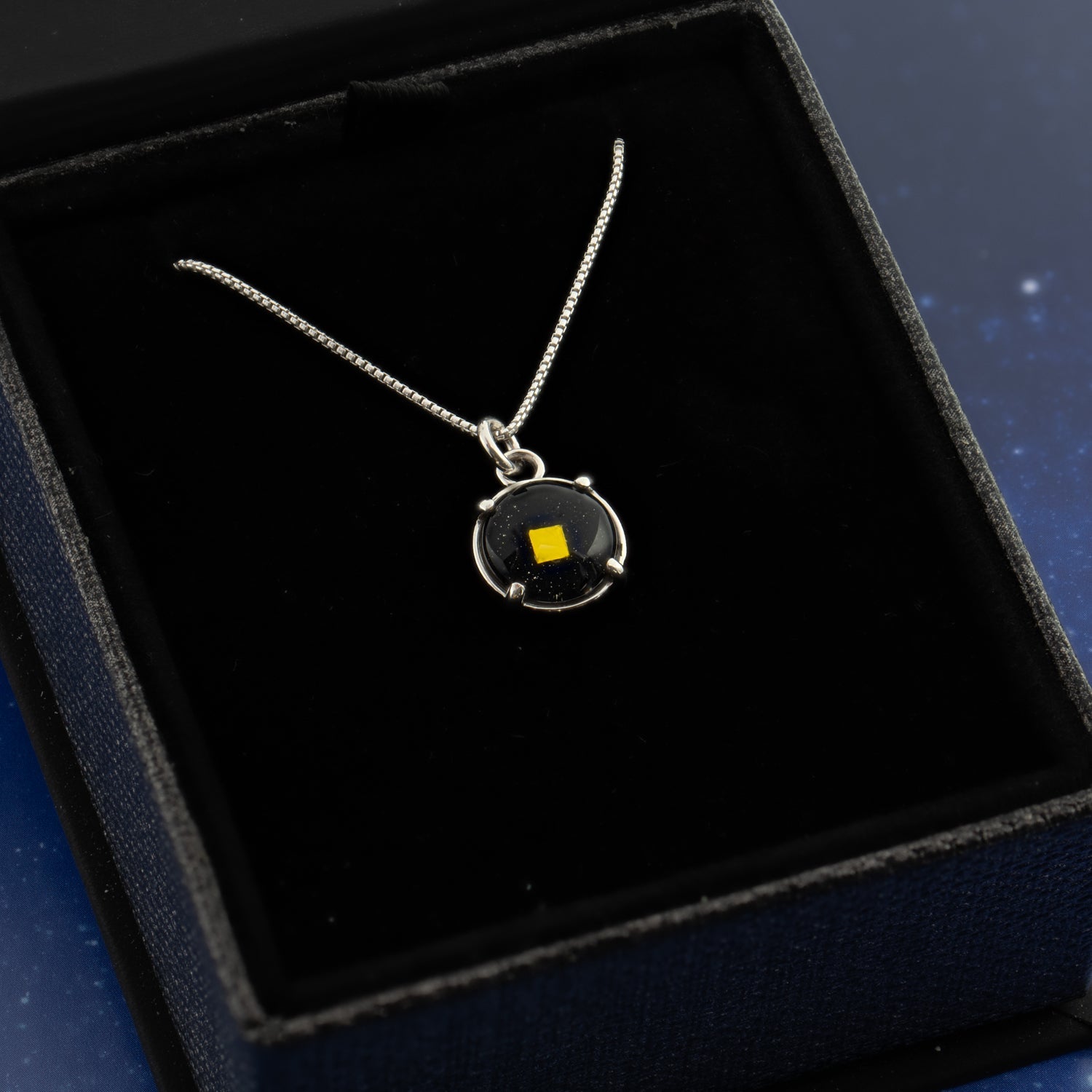 This pendant, handmade here at Mini Museum, contains an actual, mission-flown fragment of Kapton foil from the Apollo 11 Command Module Columbia. This material helped protect Apollo astronauts Neil Armstrong, Buzz Aldrin, and Michael Collins on their journey from Earth to the Moon and back. Salvaged after splashdown, this is a unique collectible from one of the greatest achievements in human history.