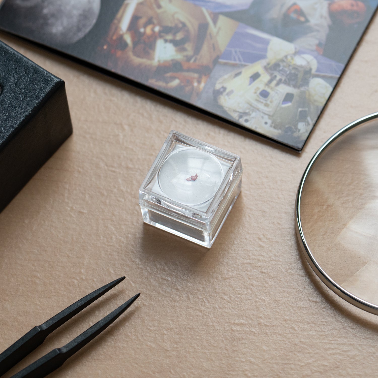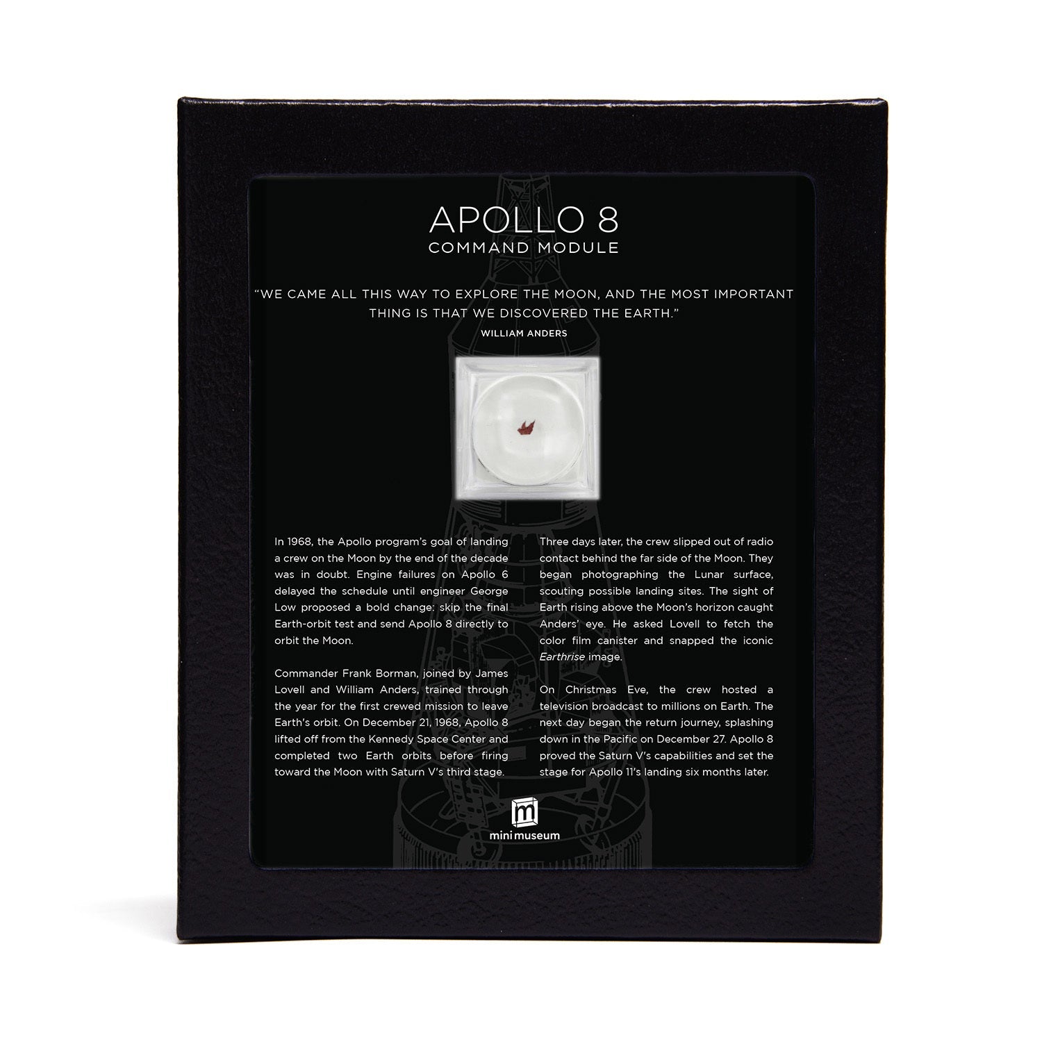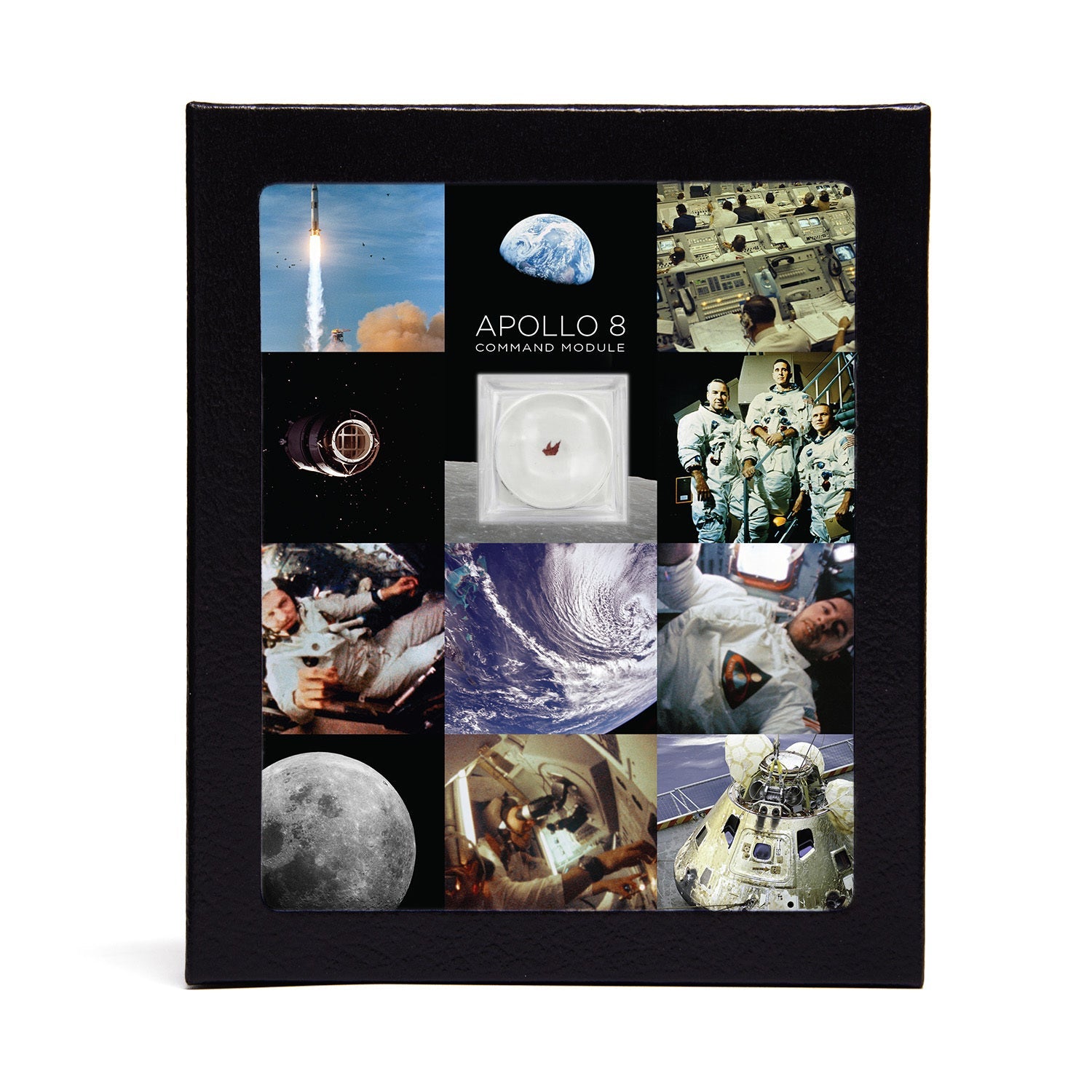 The red expansion joint specimen is enclosed in an acrylic cube with a magnified lid and includes a glass-topped display case, information card, and certificate of authenticity. The information card showcases images from the Apollo 8 mission, details about the journey, and a die-cut square that matches the size of the acrylic cube. The material was part of Apollo 8's thermal protection system, which was crucial to surviving the intense heat of atmospheric reentry.