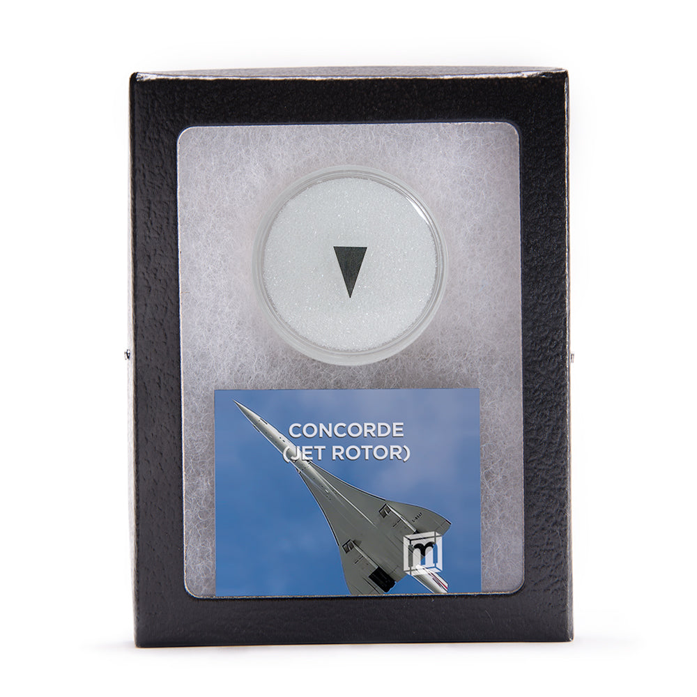 This specimen is a fragment of a high-pressure compressor vane taken from the jet engine of the Concorde. The original titanium vane was divided into long, thin slices using a high energy cutter, after which each slice was hand-polished and cut into the "delta-wing" shape you see here. This is the same process we used to produce the specimen in the Mini Museum itself, but this larger specimen measures approximately 1 cm in length.