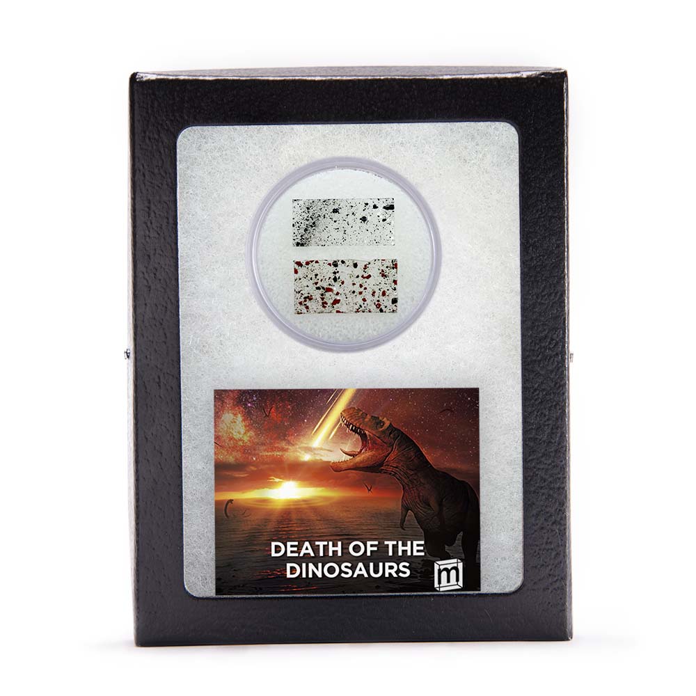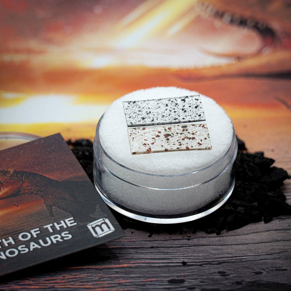 As pictured above, this item includes the physical evidence behind the two leading theories for the death of the dinosaurs: the Chicxulub Asteroid Impact and the flood basalts of the Indian Subcontinent known as the Deccan Traps.