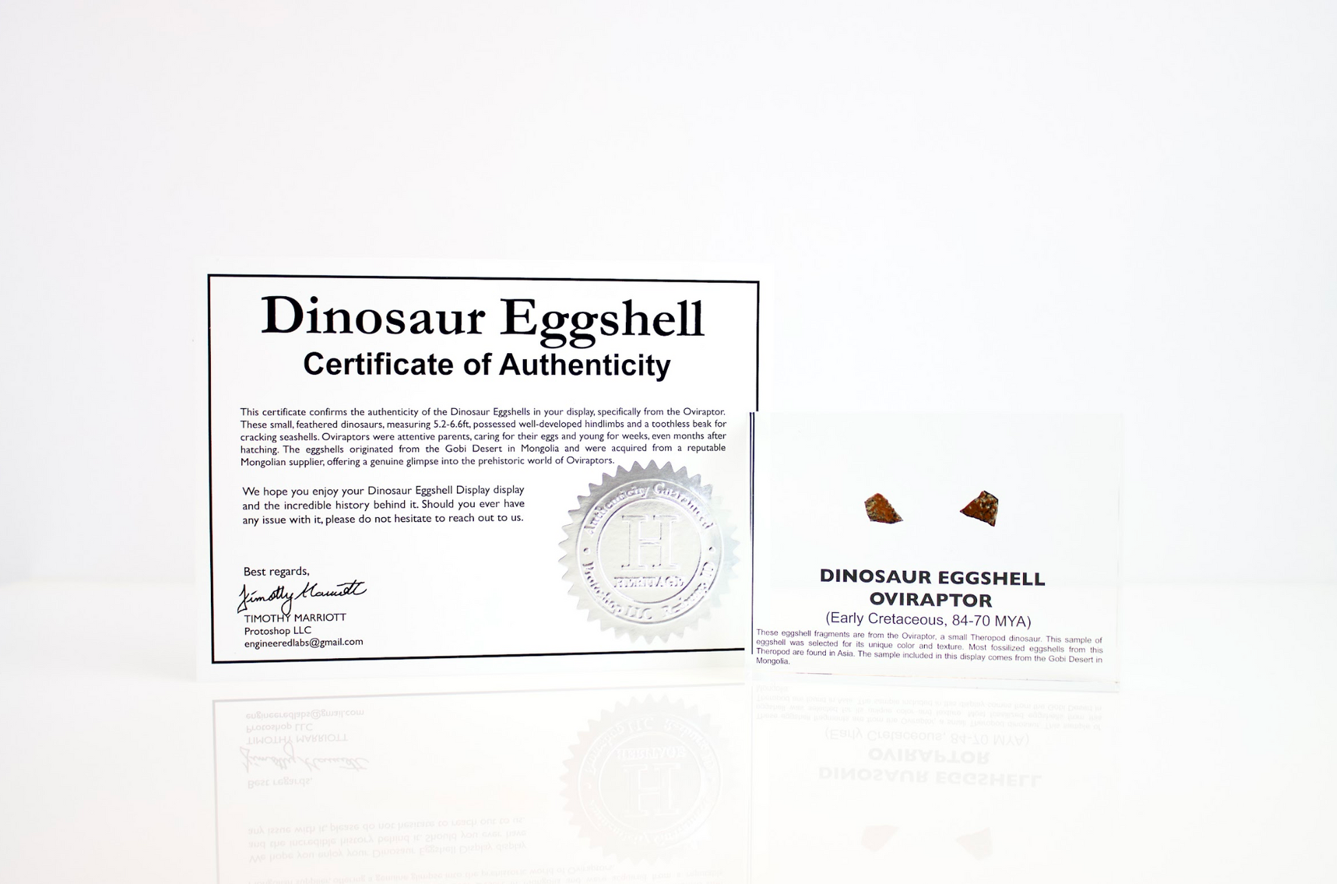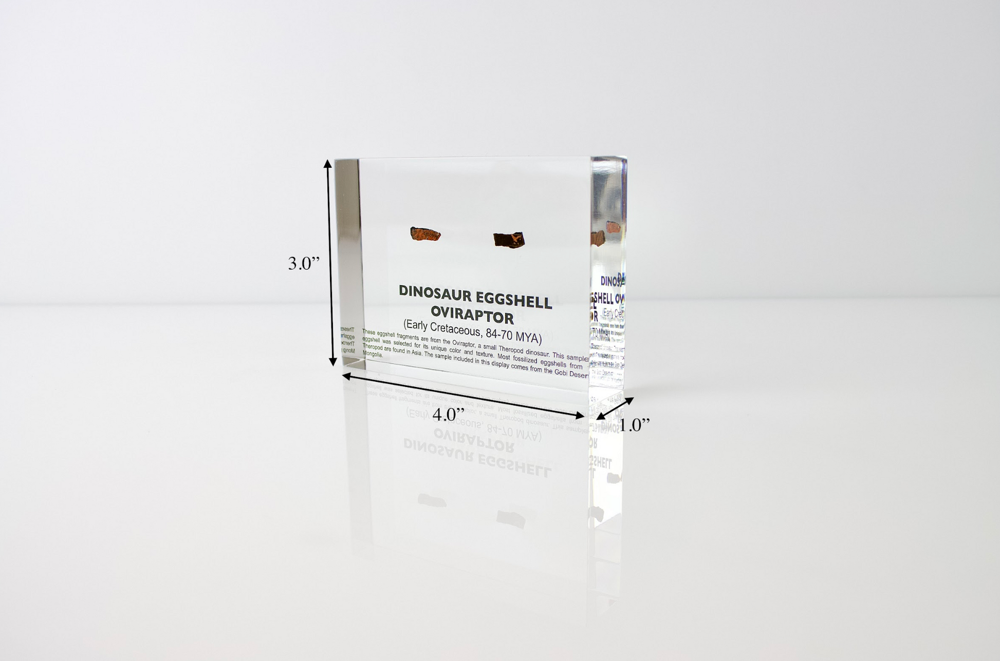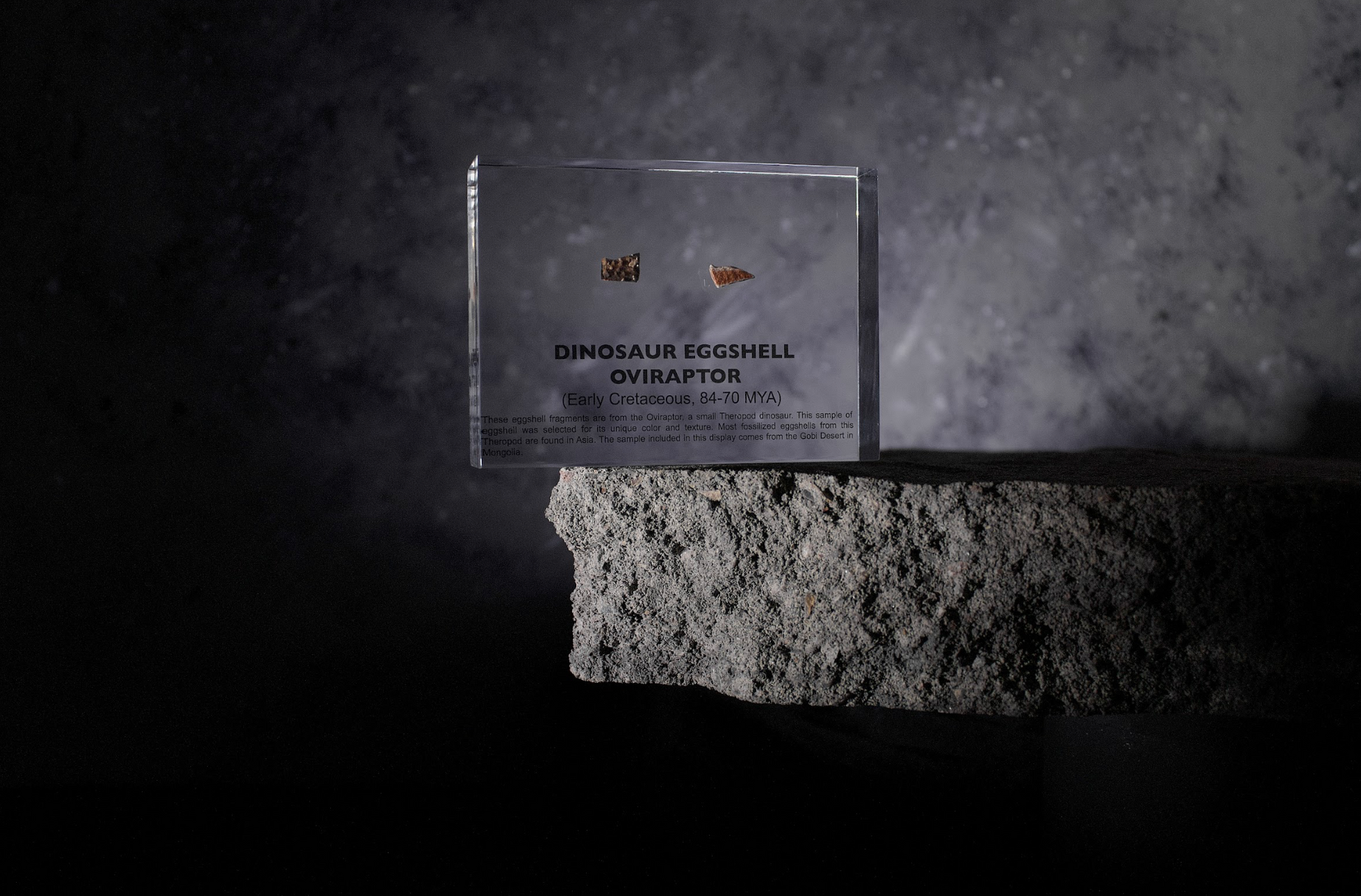 These eggshell fragments are from the Oviraptor, a small Theropod dinosaur. This sample of eggshell was selected for its unique color and texture. Most fossilized eggshells from this Theropod are found in Asia. The sample included in this display comes from the Gobi Desert in Mongolia.