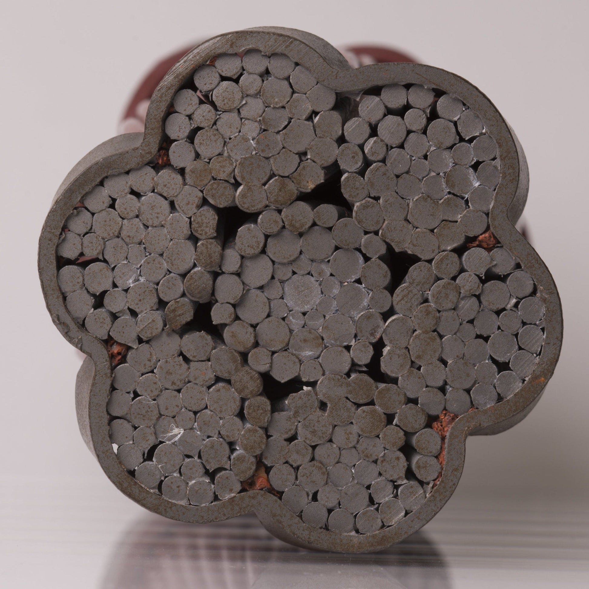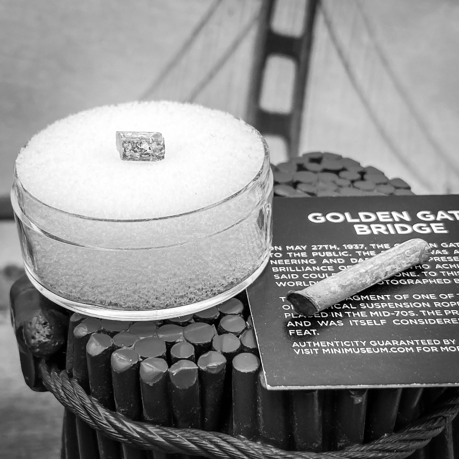 This specimen is a fragment of one of the original 250 pairs of vertical suspender ropes attached to the main cables. The ropes were replaced in the mid-70s, and the State of California sold some of the material to help pay for the work. The process took four years and was itself considered a major engineering feat.