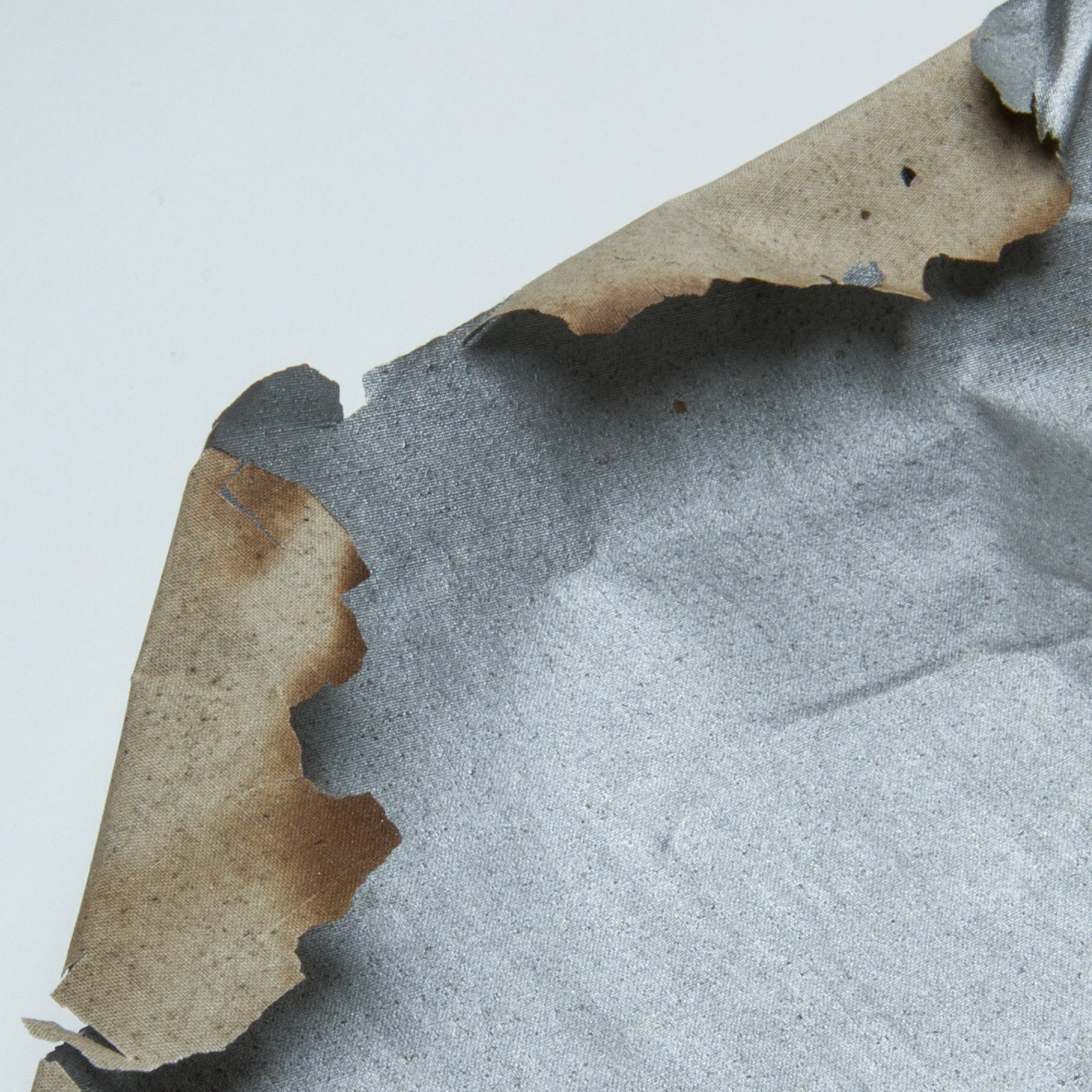 Swatches vary in size and shape, but each measures approximately one square centimeter in area. Swatches may exhibit uneven edges or have areas where the cloth beneath the aluminum doping is visible.