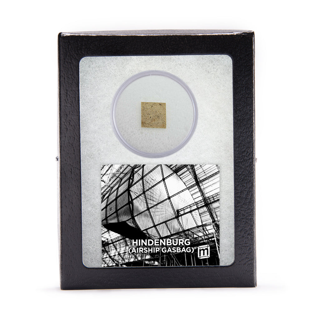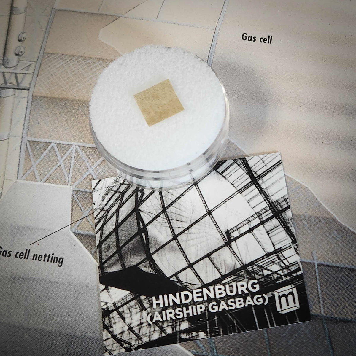 This specimen is a piece of one of the gas cells from the Hindenburg. The chambers were made with a new gelatine-brushed cotton. The specimen was acquired from one of the largest private collections of Hindenburg artifacts in the world. It was originally retrieved at the scene in 1937 by journalist Harry Kroh. Kroh was a local reporter dispatched to cover what was expected to be a routine landing, but turned into one the most well-covered disasters in history.