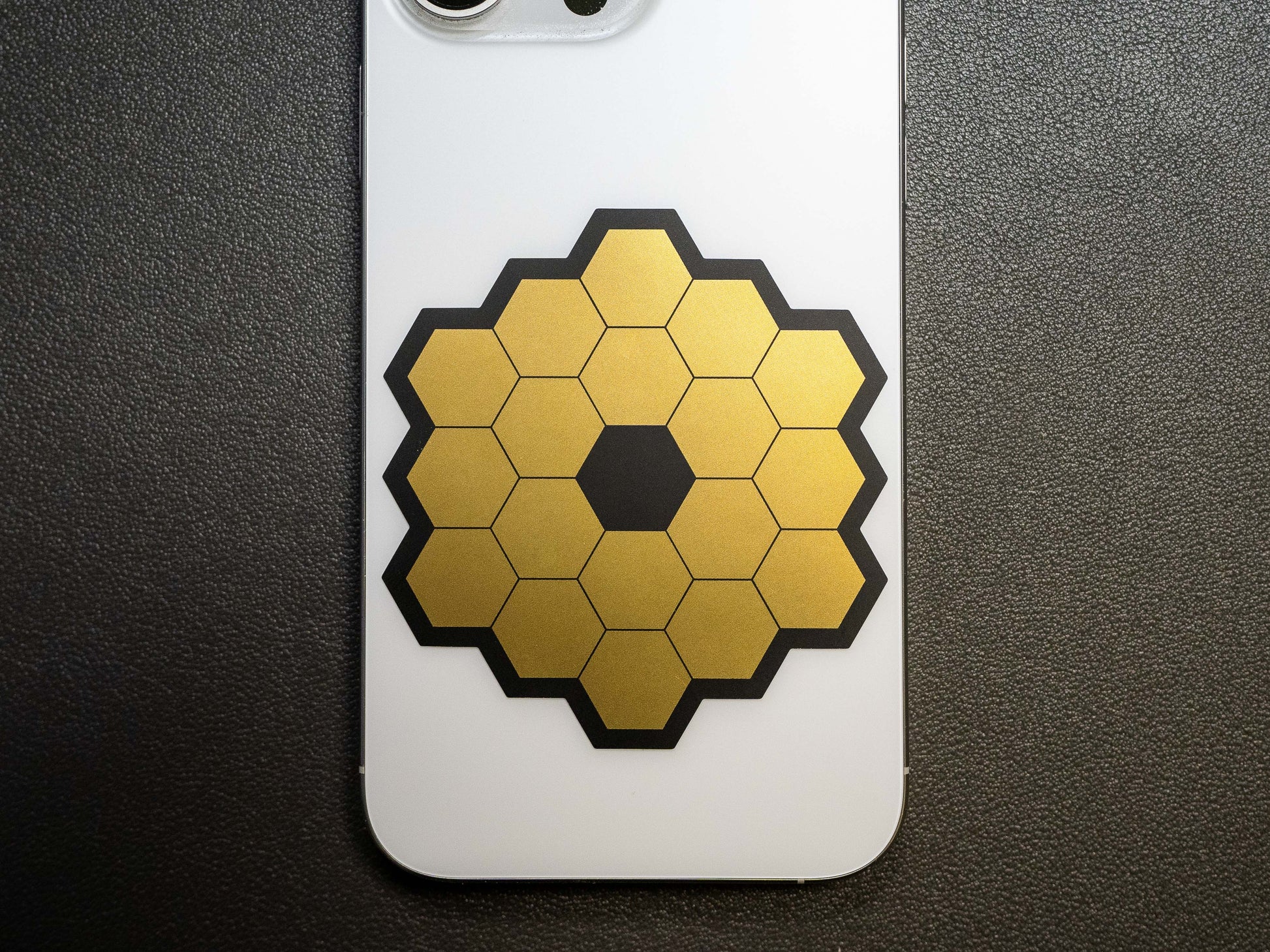 Celebrate the James Webb Space Telescope (JWST) with this stunning gold foil sticker! Featuring the iconic hexagonal mirror design, this die-cut, waterproof sticker is perfect for any space enthusiast.