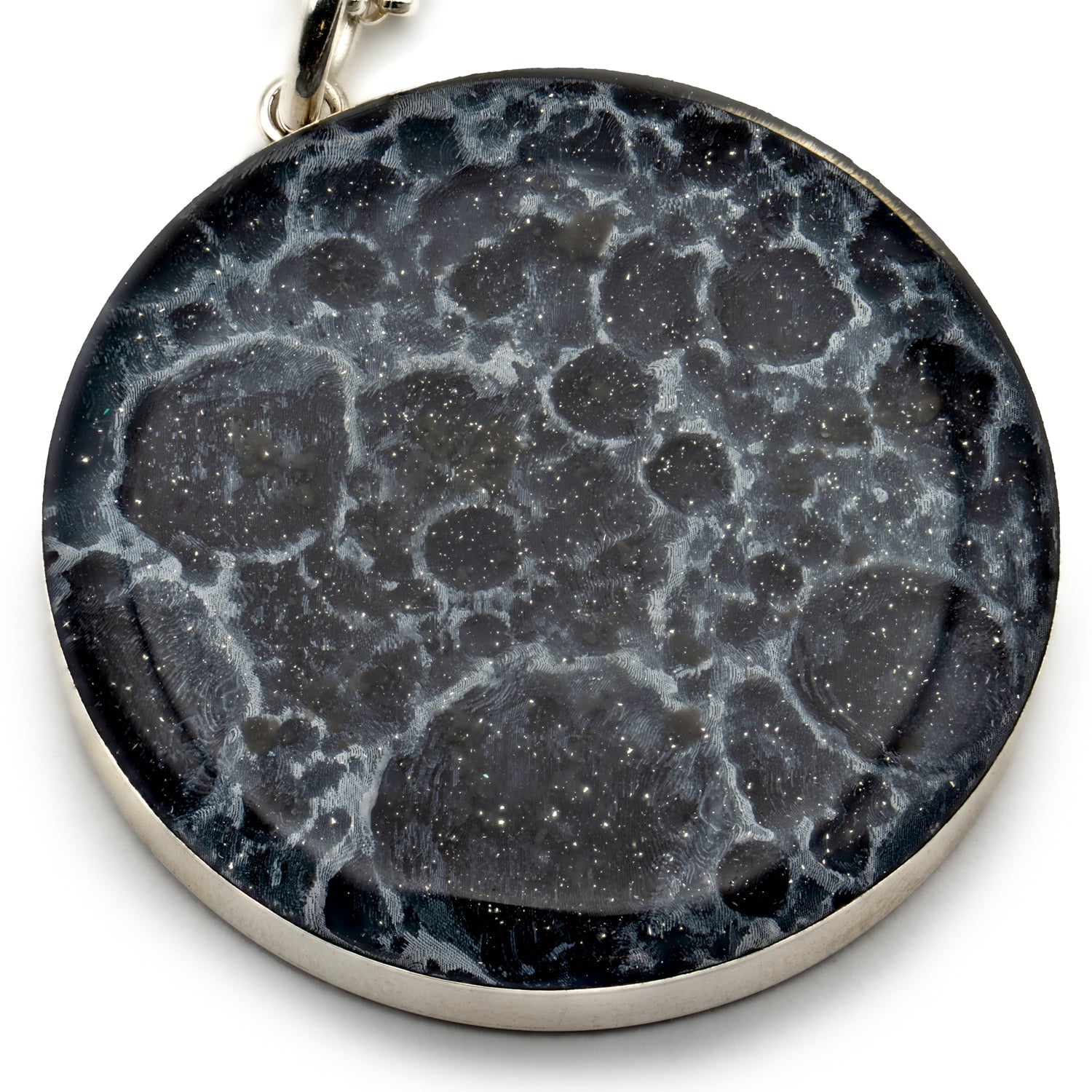 This necklace contains a hand-crafted pendant which contains lunar dust material. It comes from the lunar meteorite NWA 5000 which originated on the light colored highlands of the Moon. The pendant was created based off a LiDAR scan of the Moon's surface, which gives it a unique and scientifically accurate look. We’ve captured the Moon’s craters, valleys, and mountains in all their lunar glory, and put them right on your neck!