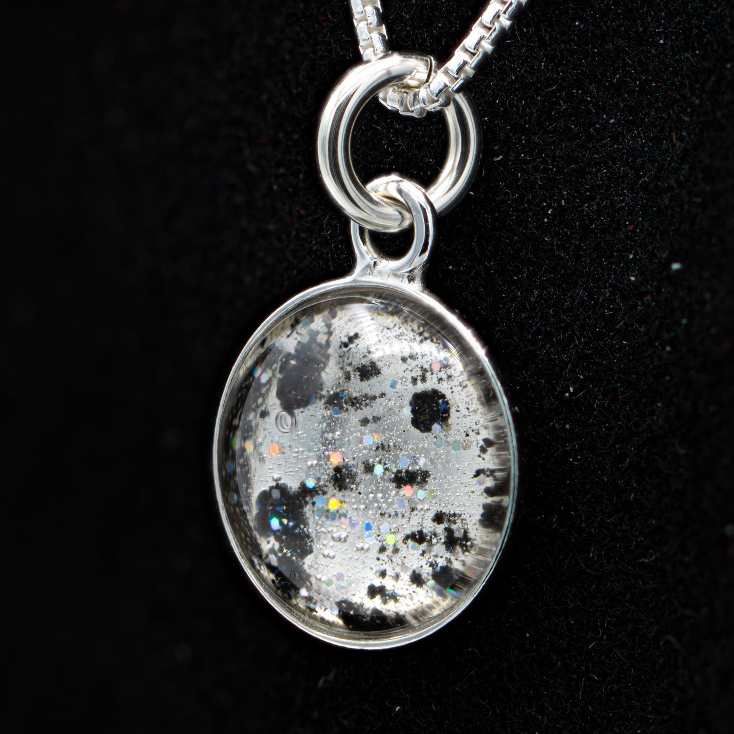 This exclusive item is crafted here at the Mini Museum workshop with a crystal-clear glass top, sterling silver backing, and an 18" chain. It's an incredible piece of astronomic jewelry made with rare and ancient meteoritic material!