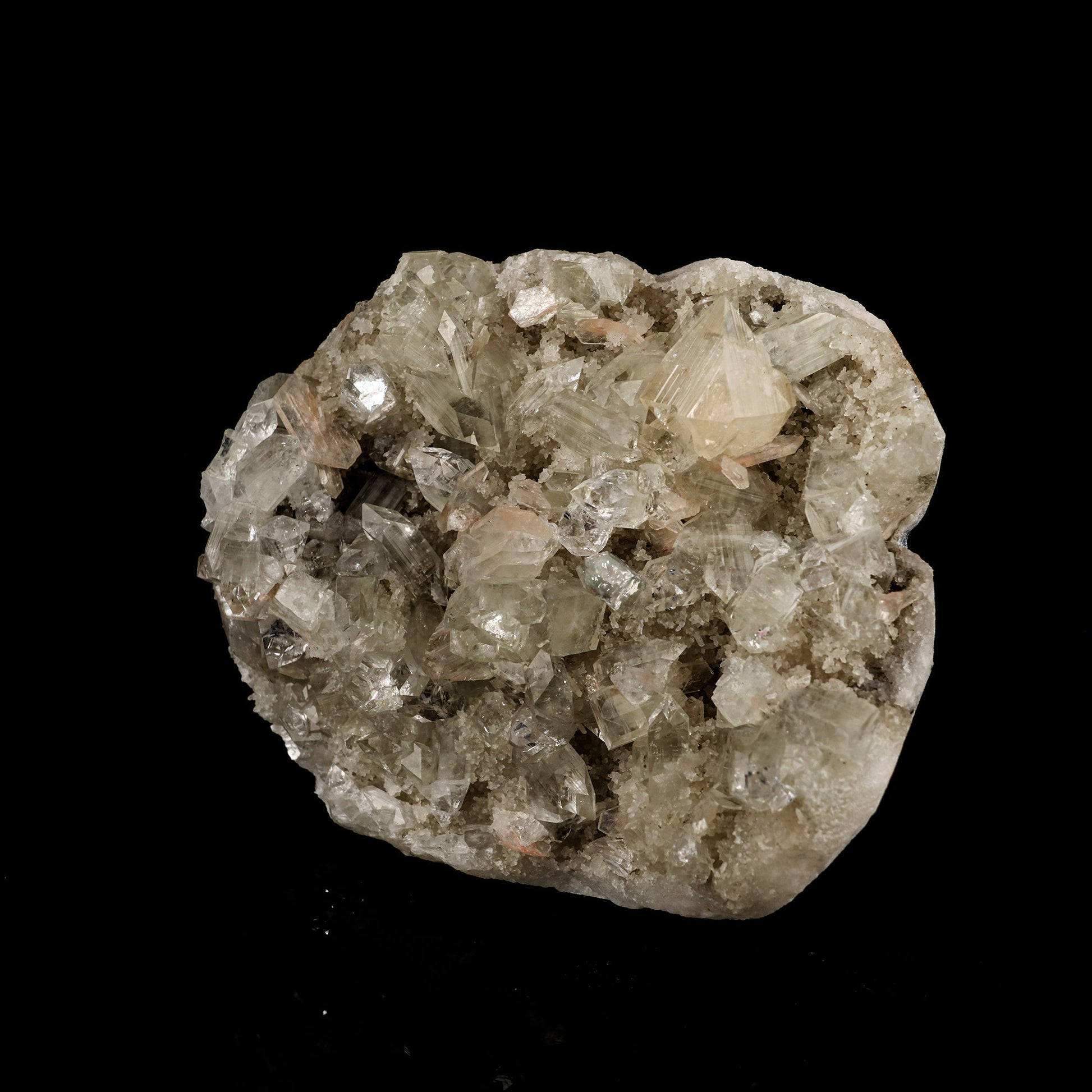 Alluring Powellite is the rarest and most desirable mineral from the famed Deccan Trap basalts of India. These glassy and gemmy, yellow-orange crystal rest on less developed Powellite, which in turn rests on a matrix of massive pink Stilbite & Apophyllite. Showy and highly representative combination material from this locality, the Powellites on this small cab also have the classic, brilliant golden fluorescence that you would want. Excellent quality and aesthetics.