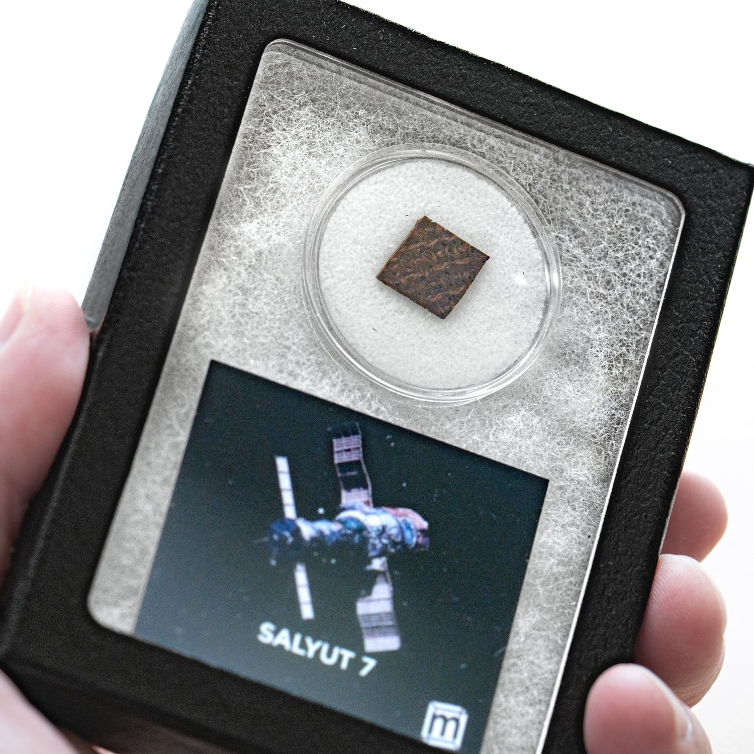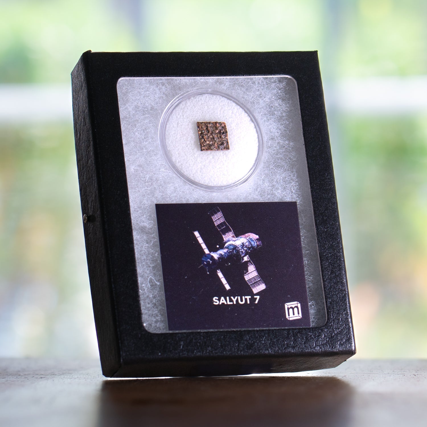 Once the Mir space station was online, Salyut 7 was abandoned to eventually burn up in the atmosphere, its pieces scattering over Capitán Bermúdez, Argentina. This specimen is a piece of the spacecraft, recovered after its impact.