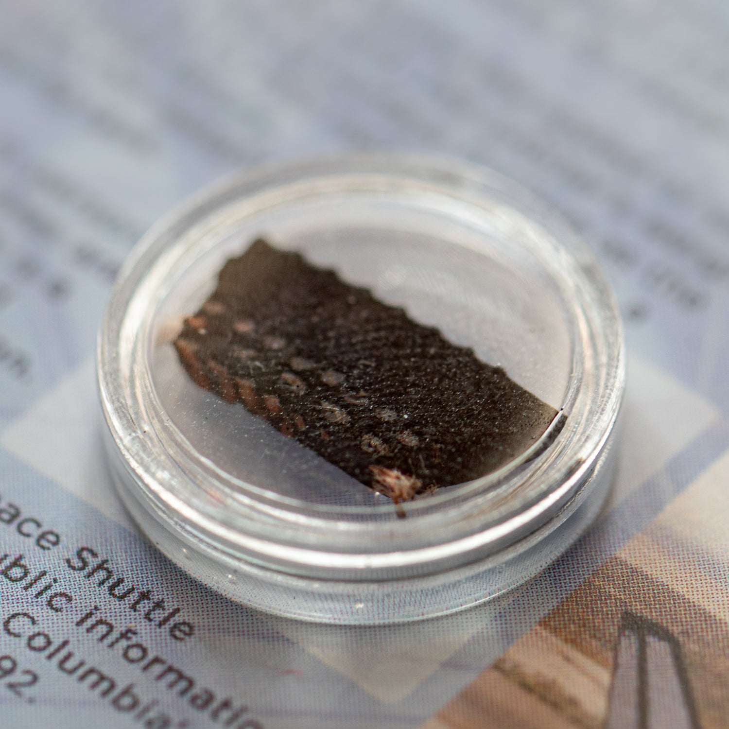 This specimen is a mission-flown nose landing gear tire fragment from the Space Shuttle Columbia (OV-102). Serial number verification against public information indicates the tire was removed from service after Columbia's 13th mission (STS-52).