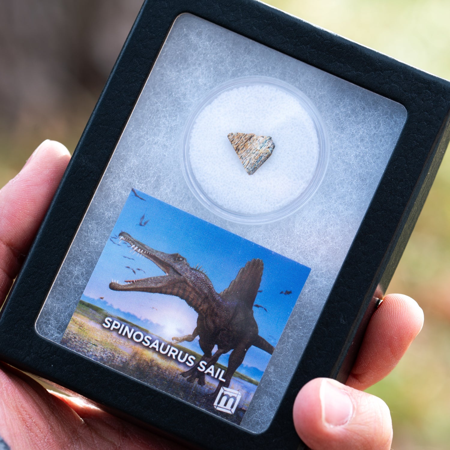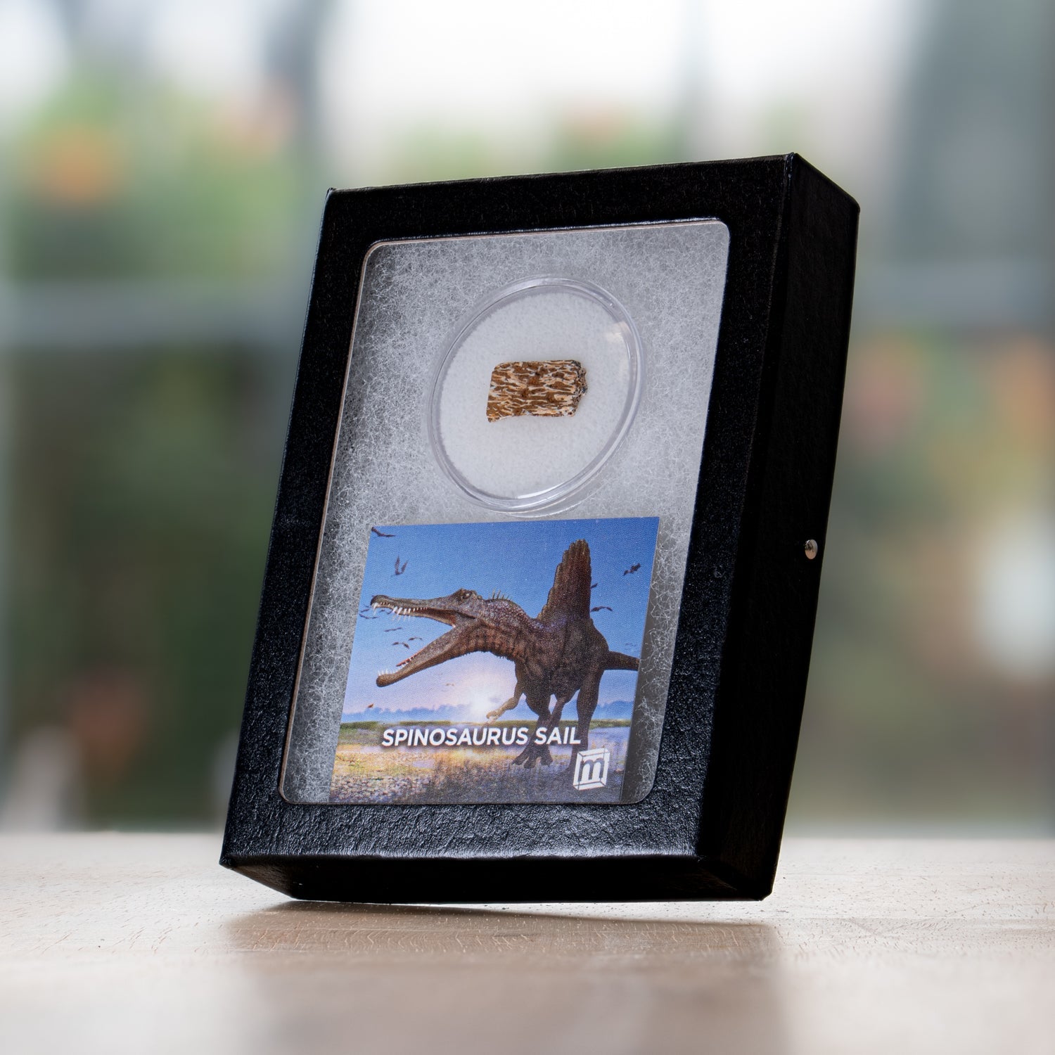 This specimen is a piece of a fossil Spinosaurus neural spine from the Kem Kem fossil beds of Morocco. It comes complete with an informational card that serves as statement of authenticity.