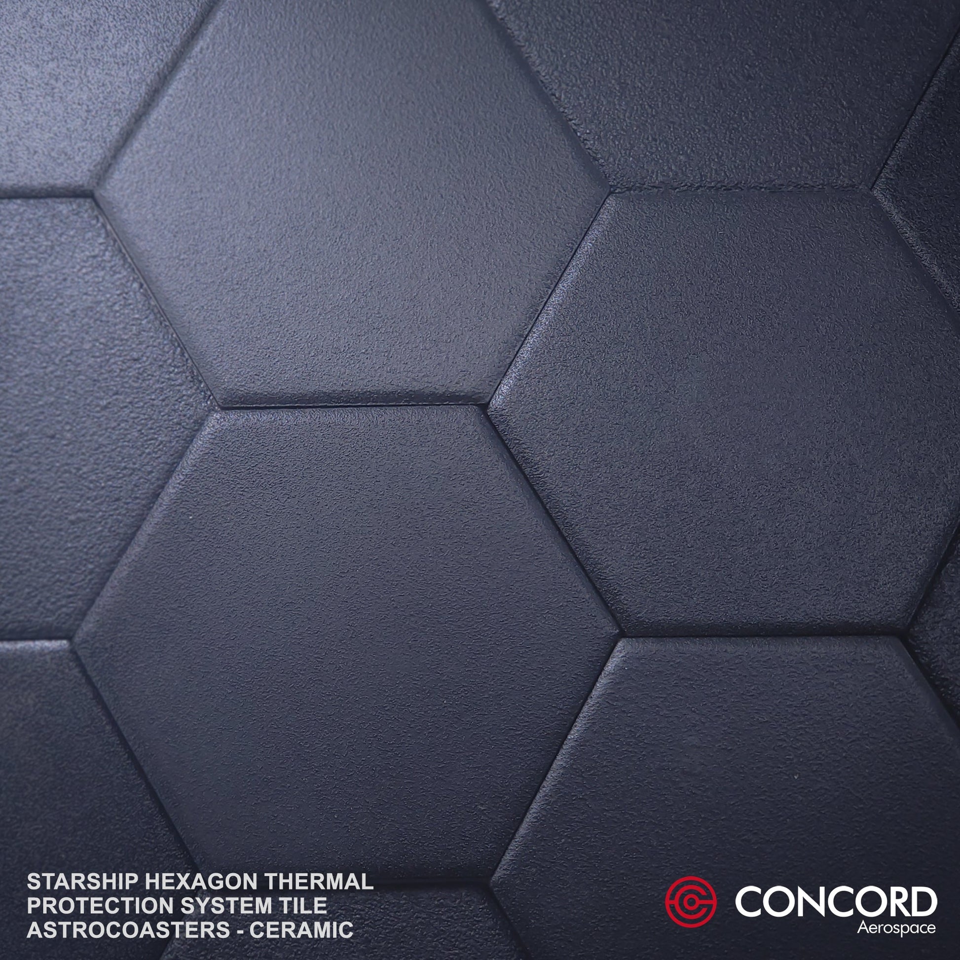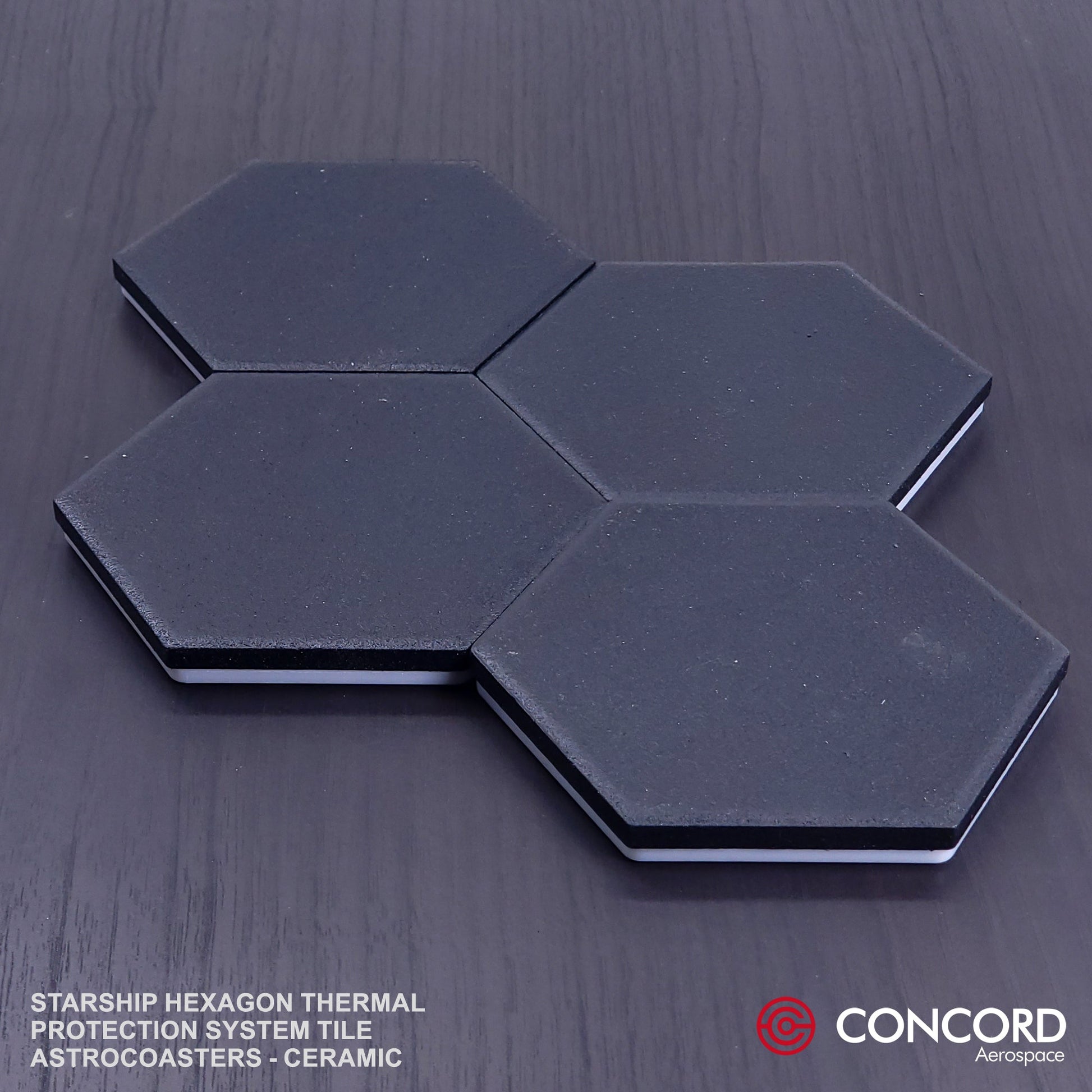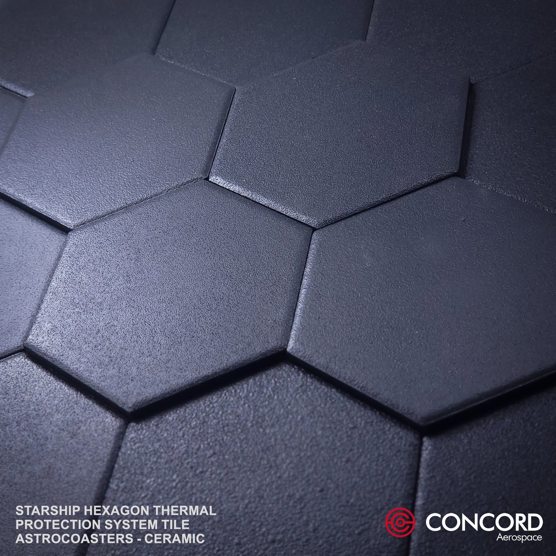 Embark on a journey through the wonders of space exploration with Concord Aerospace's STARSHIP HEXAGON TILE COASTERS—an homage to the pioneering design of SpaceX's Starship spacecraft. Meticulously crafted from actual ceramic, these coasters faithfully replicate the thermal protection tiles from the Starship's groundbreaking heat shield, each measuring 4" x 4" x 0.75".