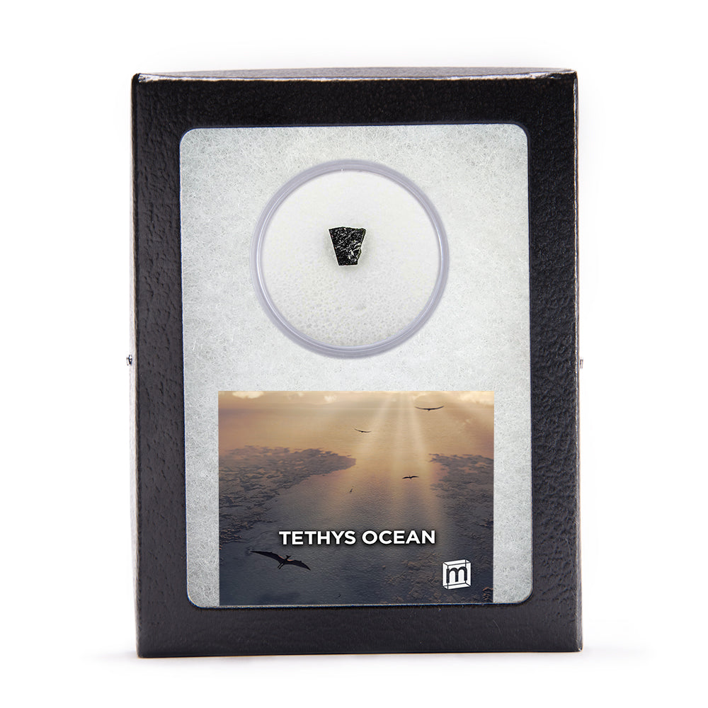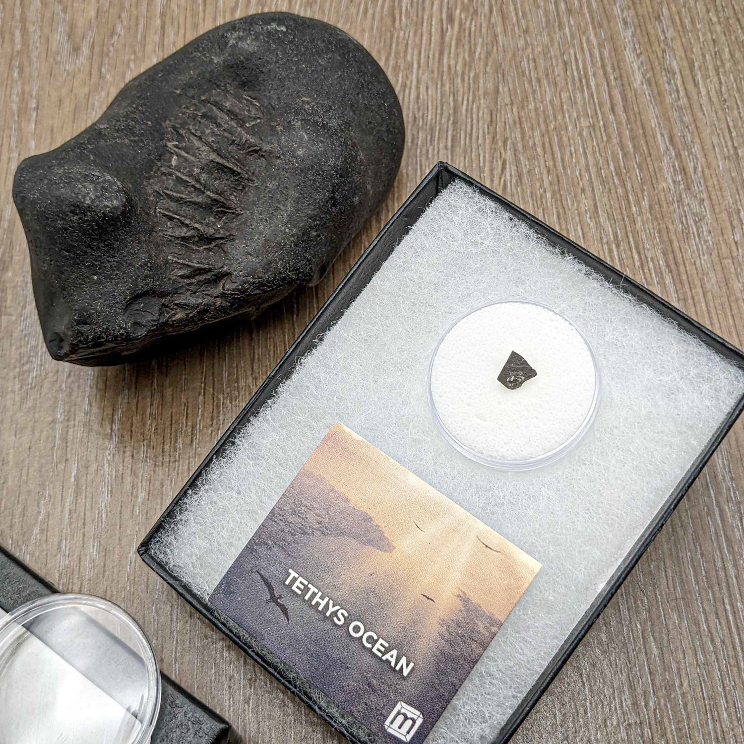 This specimen is a piece of oceanic slate from the prehistoric Tethys seafloor. It was recovered from the banks of the Gandaki River in the Himalayas, where the remains of the ocean have become mountains.