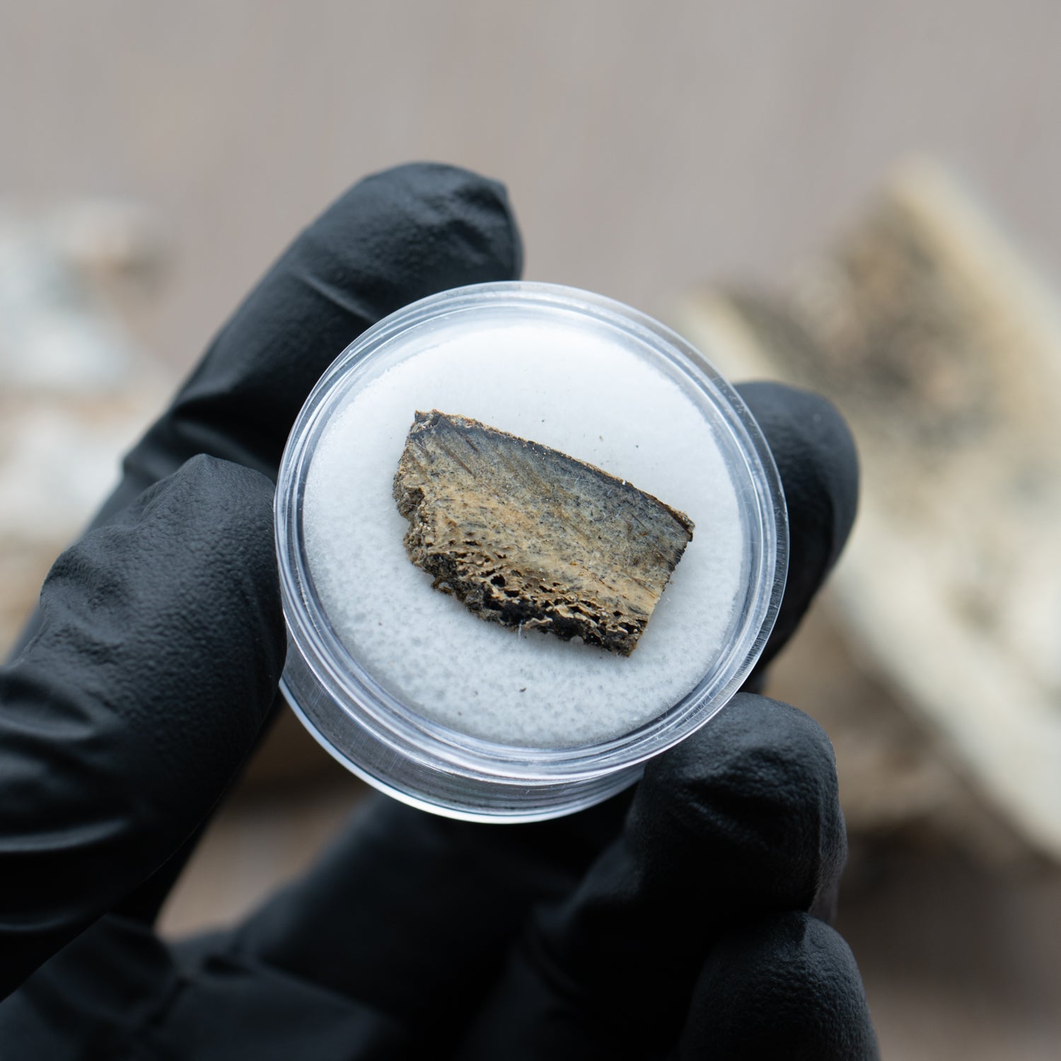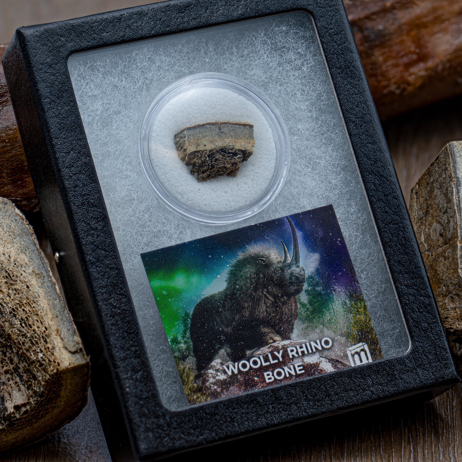 The fossil is set into a padded gem jar and placed within a glass-topped riker box display case. The case measures 4 1/2" x 3 1/2" and a small photo display card is also included. The card serves as the certificate of authenticity and includes information about the Woolly Rhino on the reverse side.